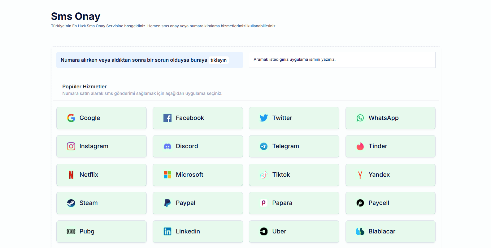Sundukları Servisleri görünce Telegram ve İnstagram için sms onayı aldım. işlemlerimi zahmetsizce hallettim. istediğim platformda üyelik açabiliyorum. Hem hızlı hem de kullanıcı dostu bir site olmuş.